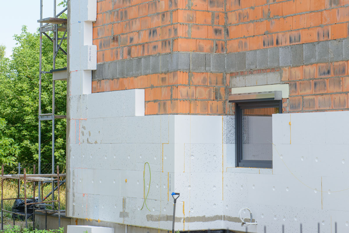 mury zewnętrzne to ściany konstrukcyjne pustak Cerpol Mega MAX grubość 25cm ocieplone styropianem grubości 20 cm.