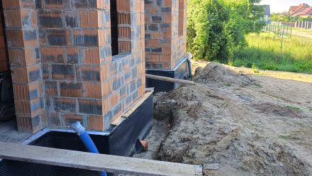 mury fundamentowe z bloczków betonowych M6 grubości 25 cm na zaprawie cementowej. Izolacja pozioma z plastpapy, izolacja pionowa dysperbit. Izolacja cieplna styropian grubość 10 cm lub styrodur ekstrudowany.